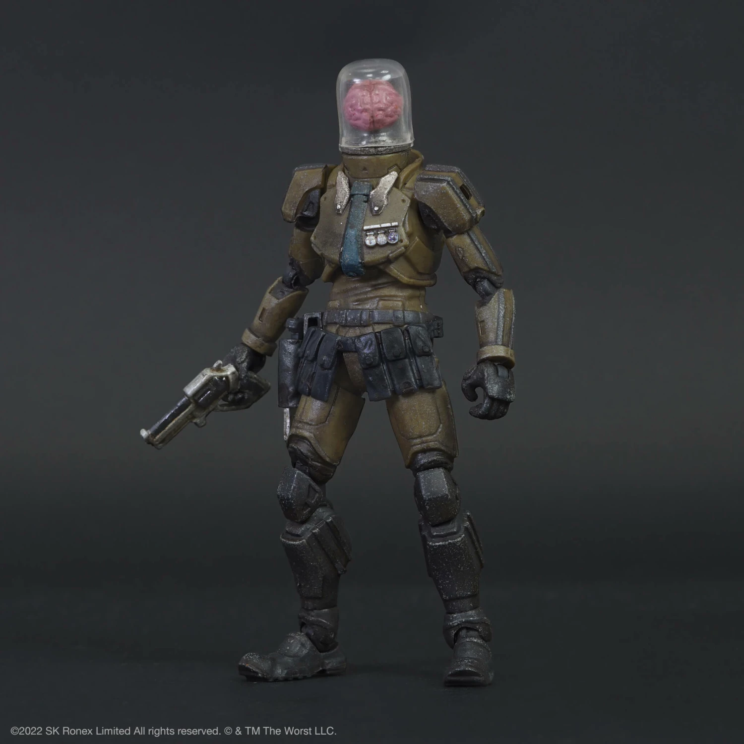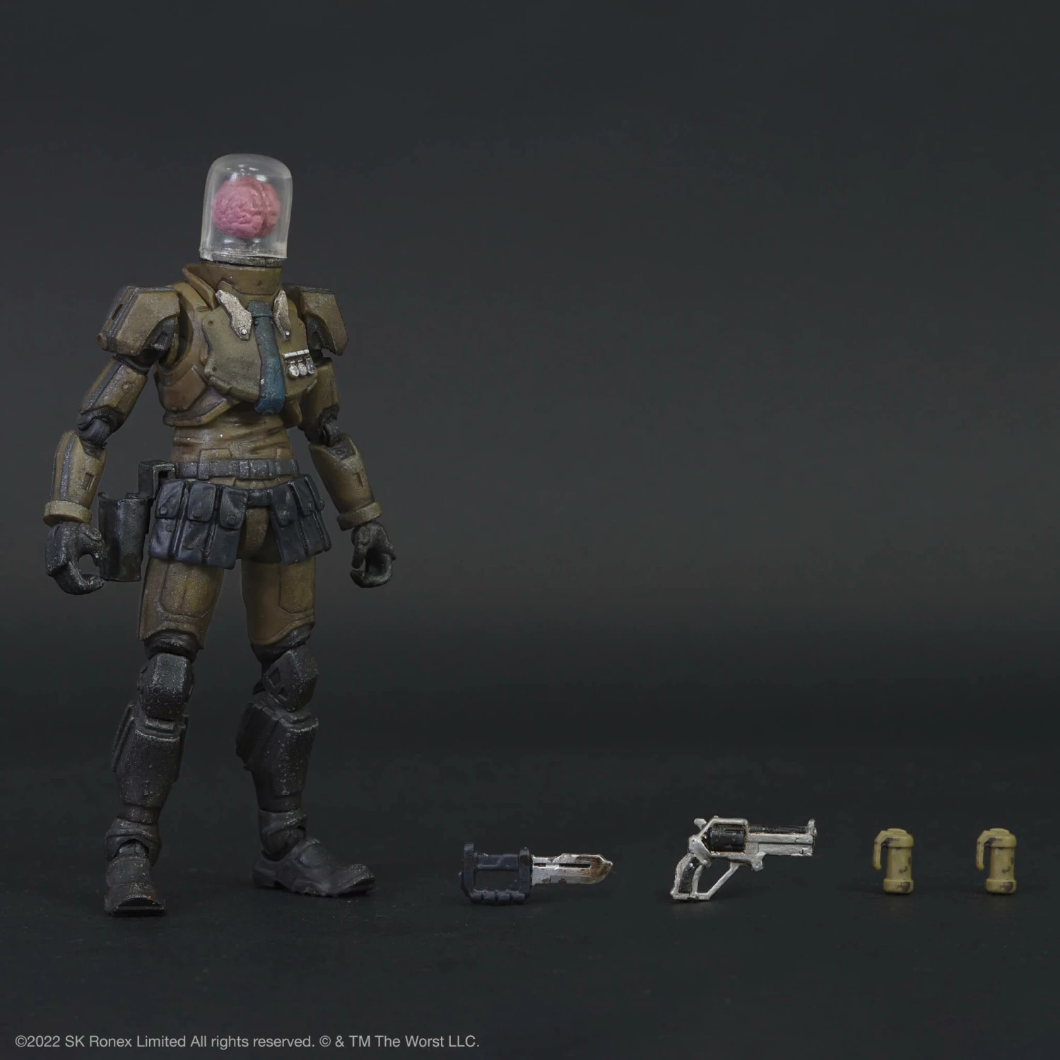 A Super7 collaboration with Kit Lau and his original action figure line, Acid Rain World, Cortex Commander is a highly detailed 1:18 scale action figure with 19 points of articulation and interchangeable accessories. This fully weathered figure includes a “The Lobotomizer” Revolver and holster, Cranial Combat Knife, and 2 Pineal Gland Grenades, and comes with mounting points for weapons or accessories.