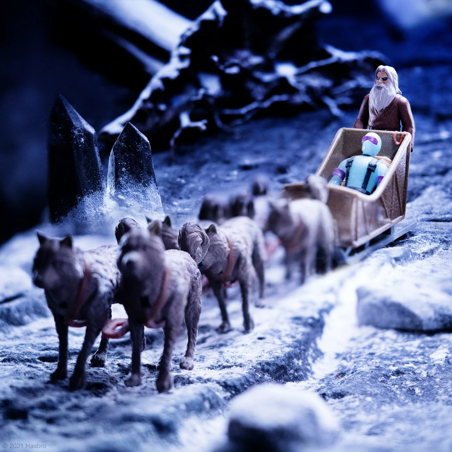 Includes Snake Eyes and Blind Woodsman ReAction figures and accessories, dog sled, and six sled dogs