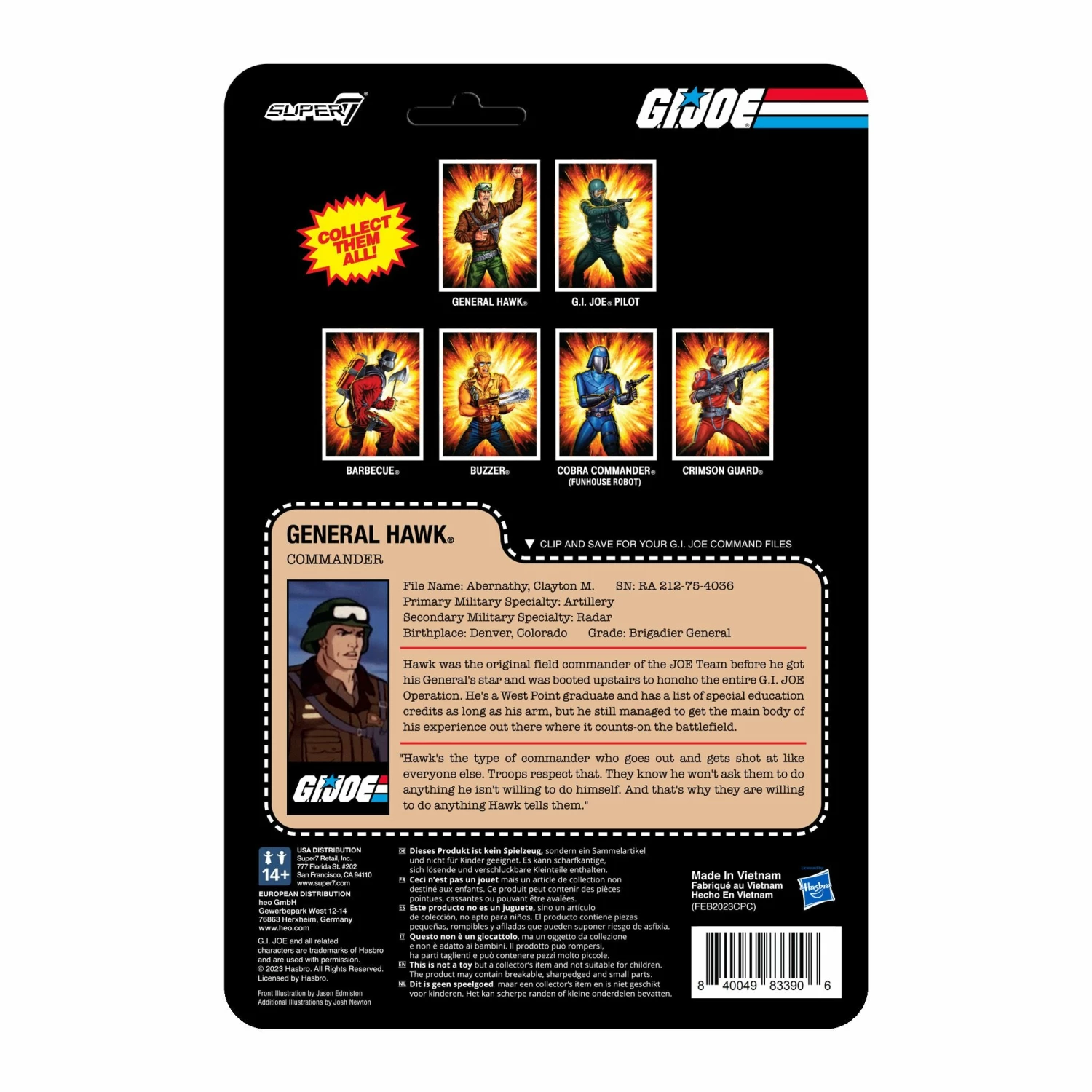 General Hawk knows that good leaders don’t just issue orders from behind a desk, they get out in the field and support the team with in-person guidance. This 3.75” scale, articulated G.I. Joe ReAction Figure of General Hawk features him outfitted for work on the leading edge of the fight against Cobra and includes metallic hand-blaster accessory. The struggle for global control always needs fresh heroes and so does your collection, so add the G.I. Joe ReAction Figure of General Hawk to your troop roster today!